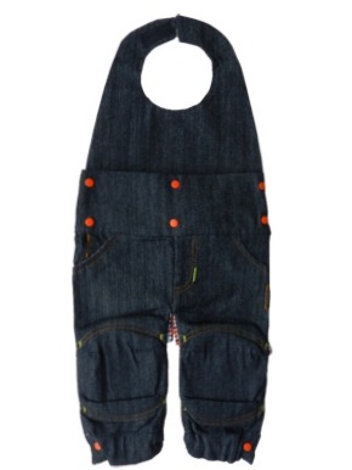 Accesorio para gatear de dos piezas desmontable y expansible, con almohadillas en las rodillas, frente de mezclilla y forro en estampado en cuadros marino y rojo con fondo blanco. Única talla de 6 a 18 meses.