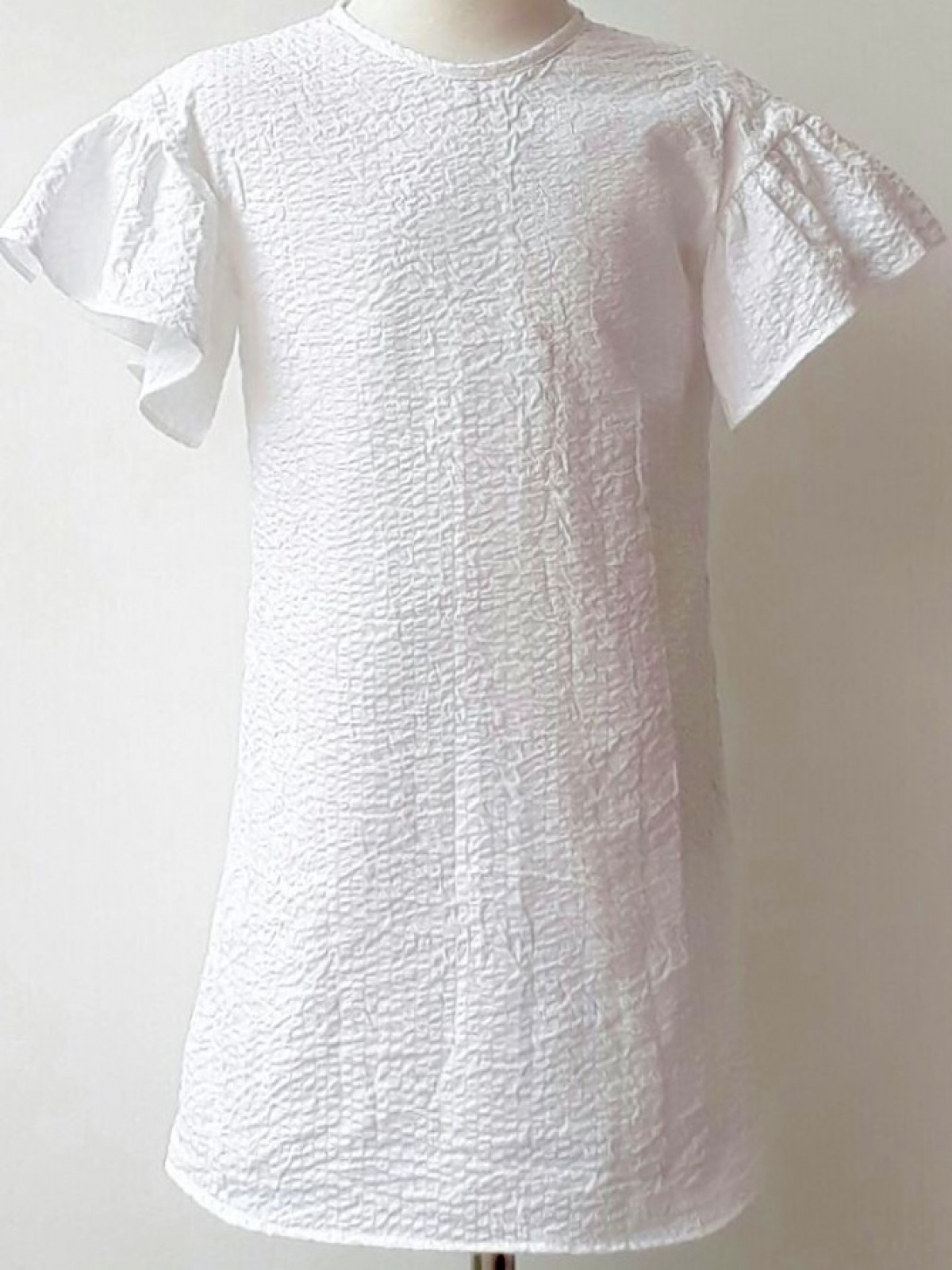 Vestido con textura de panales en color blanco, linea A, manga corta japonesa con olanes.