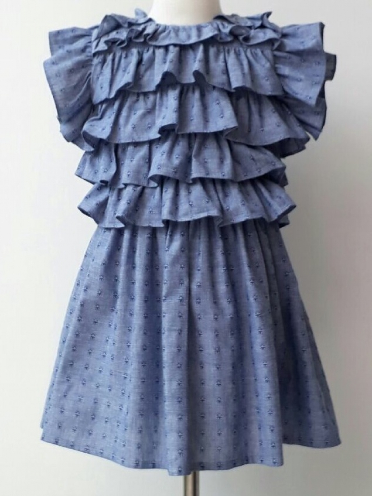 Vestido en fondo azul y estampado de abejas, falda amplia y cuerpo con olanes.