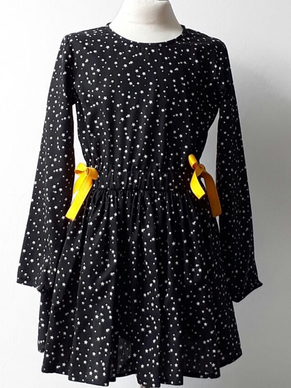 Vestido en fondo obscuro con estrella en blanco, con moños de adorno en la cintura y resorte, manga larga.