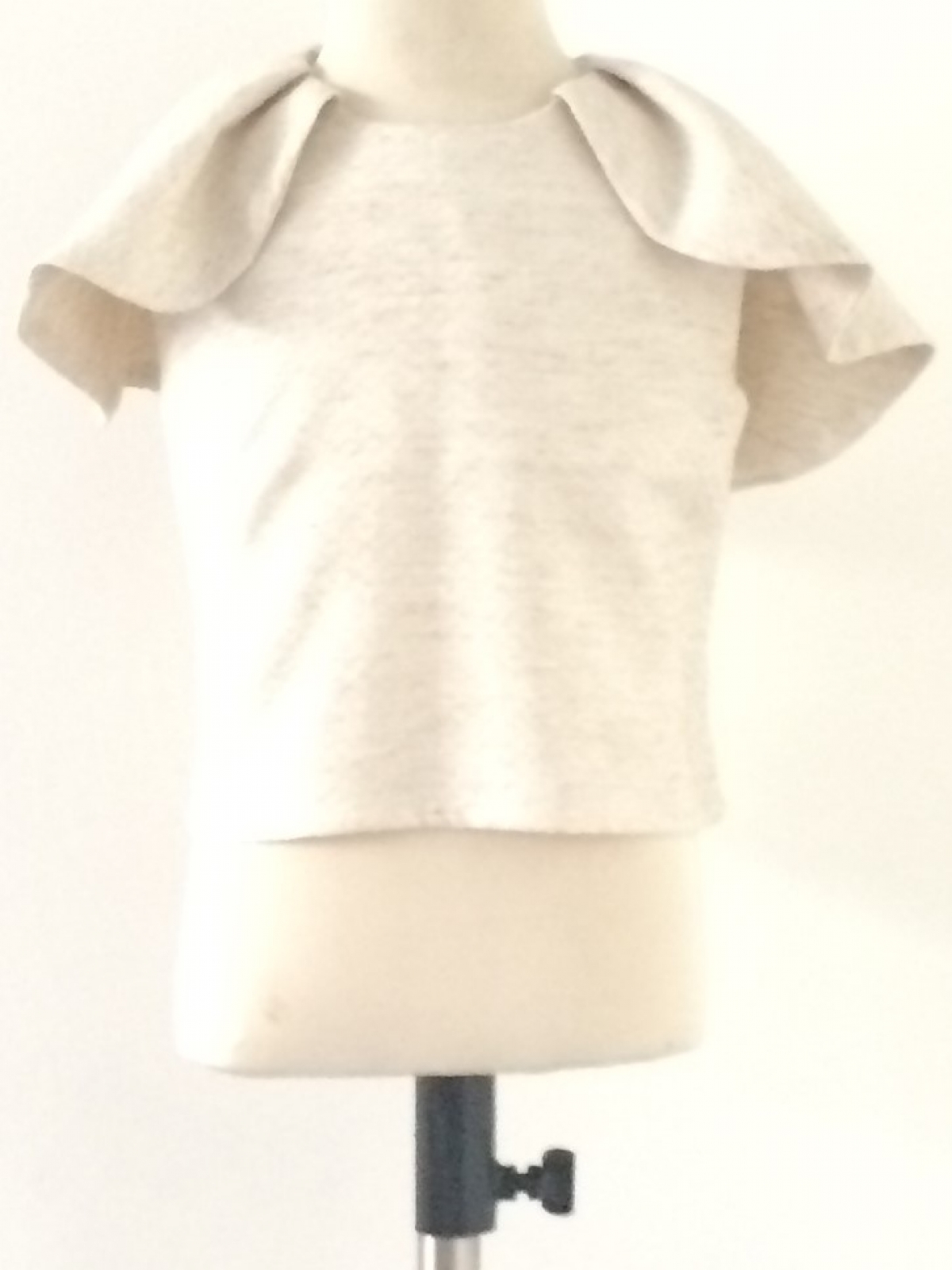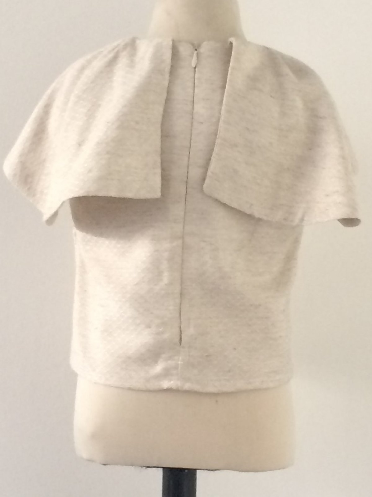 Camisa de algodón en color beige, con bordes en el mismo color en forma de panales, sin mangas y con adornos en hombros de tafetas plizadas, cierre en espalda y cuello redondo.