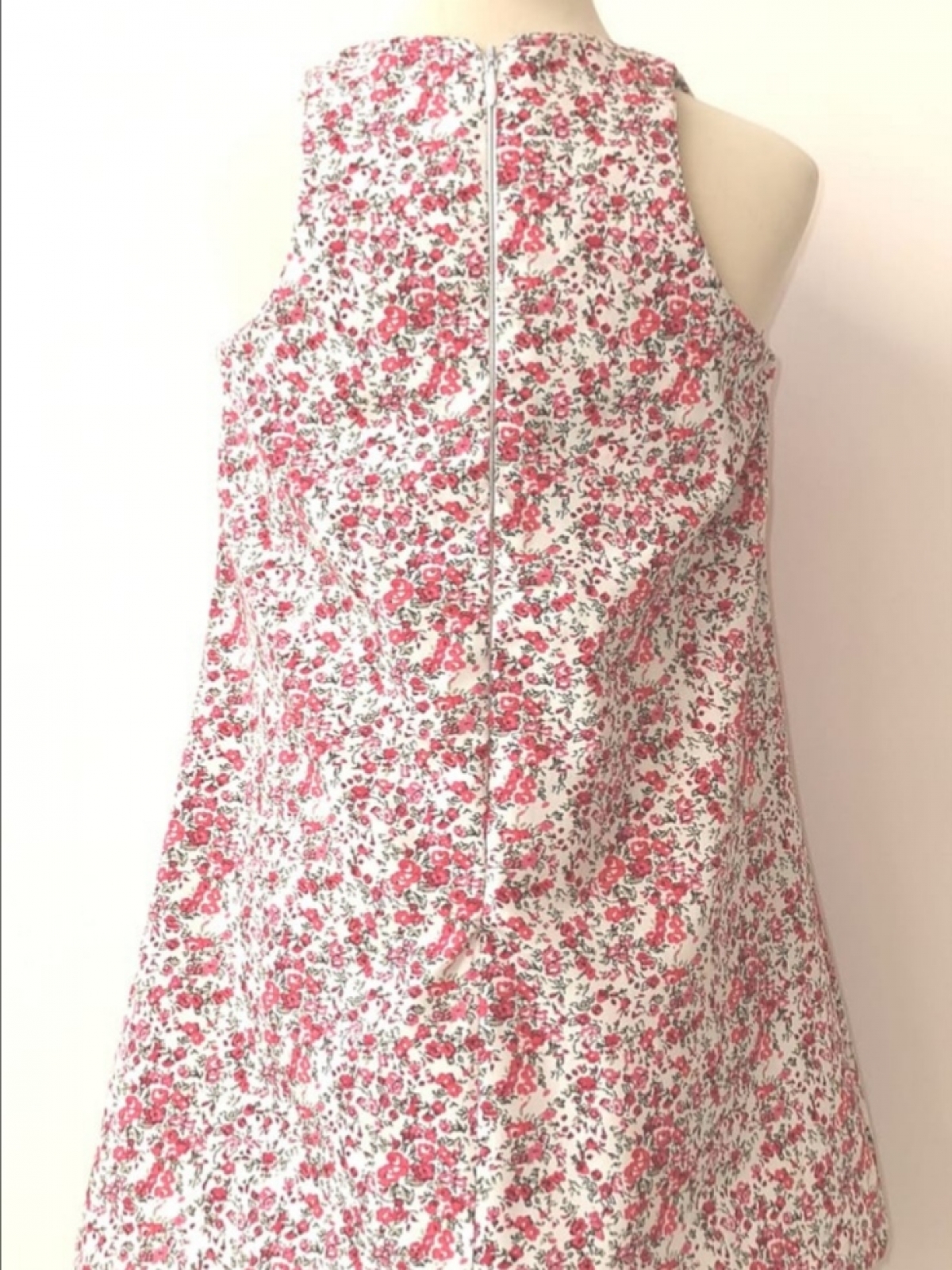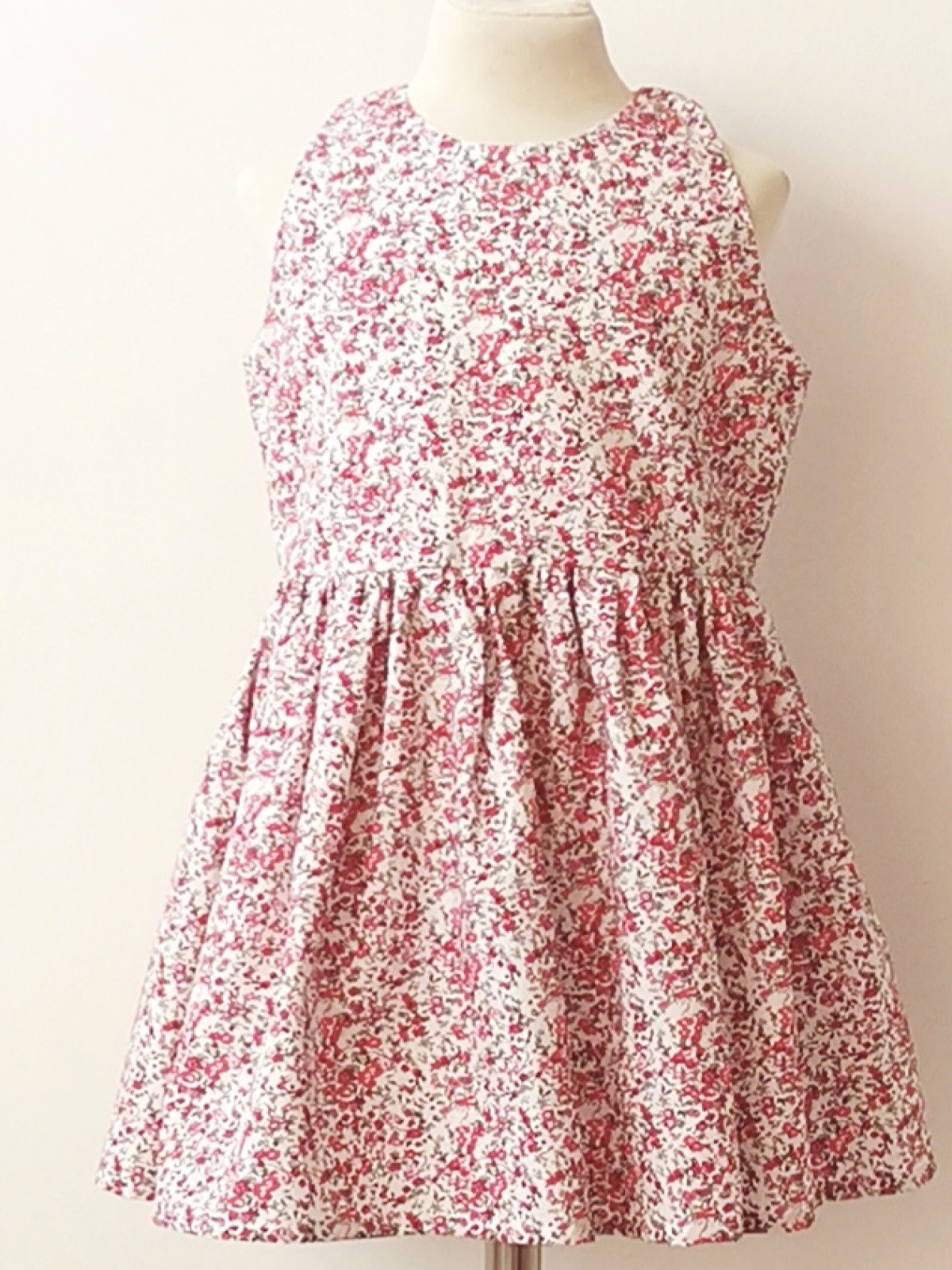 Vestido de algodón estampado en mini flores de colores rosas y rojo en fondo blanco, corte en cintura sin mangas y espalda resacada con forro.
