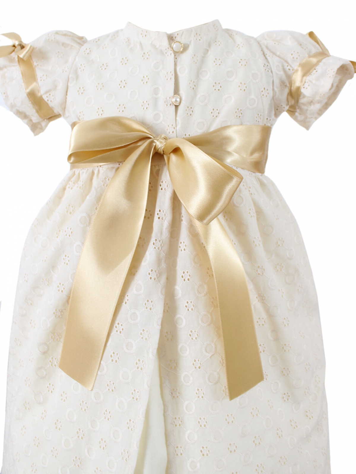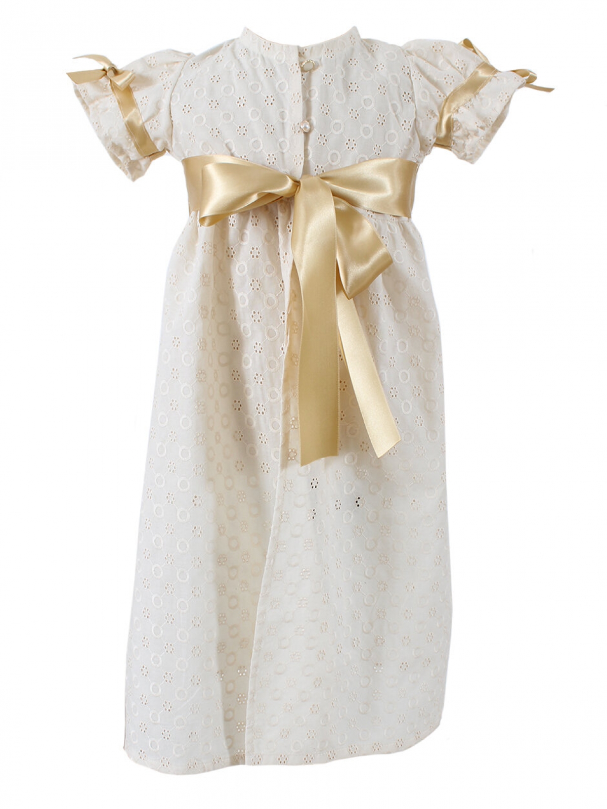 Diseño estilo español, ropón desmontable CARANA en color beige, con vestido interior en poliéster algodón color beige sencillo con cuello redondo y sin mangas, corte en pecho y faldón amplio plisado forrado con tul, chaleco en algodón calado en flores color beige con manga amplia corta, listón ancho satinado para su cierre frontal, talla única. Lavar en seco.