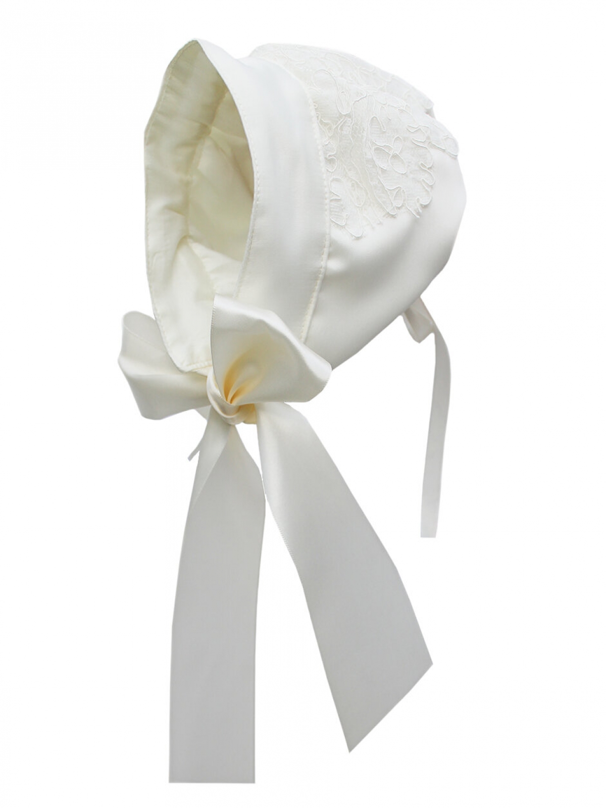 Ropón con gorro CARANA, diseño español, en color perla en tela satinada con cuello redondo, sin mangas, detalles en hombros de listones en el mismo tono, encaje bordado en pecho, corte en cintura alta, faldón amplio plisado largo con detalle de encaje bordado en la parte baja, espalda abierta con cierre de botones de perlas, vestido forrado, composición poliéster, gorro de la misma tela e color perla con detalle de adorno y listón delgado trasero para ajustar al contorno de cabeza y listón grueso español para ajustar a la cara. Lavar en seco ambas piezas. Contorno pecho hasta 66 cm, largo total desde cuello 80 cm