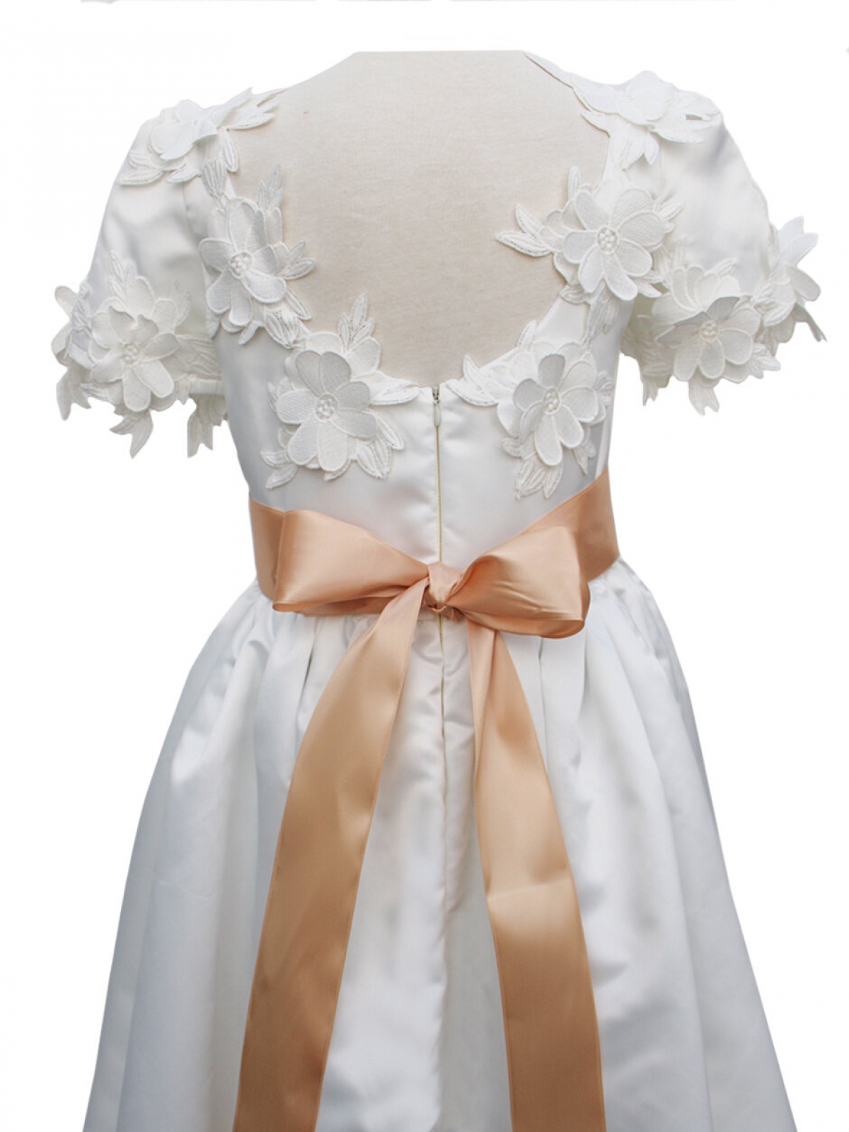 Vestido de primera comunión CARANA, estilo español en tela satinada de poliéster color off white, cuello ojal, cintura con listón ancho español en diferentes colores a elegir, manga corta con guipur ancho con flores de tercera dimensión al tono, espalda escotada redonda con guipur de flores de tercera dimensión y cierre invisible, el listón español largo se ata en la parte de la espalda ajustándolo al tamaño de cintura, vestido forrado de poliéster, tul en faldón interno para dar volumen. Lavado en seco. Medidas talla 10 años: Contorno pecho 76 cm, contorno cintura 71cm, largo de cintura a pies 89cm, con el fajín la cintura se ajusta a la medida deseada. Medidas talla 12 años: Contorno pecho 80 cm, contorno cintura 75cm, largo de cintura a pies 92cm, con el fajín la cintura se ajusta a la medida deseada.