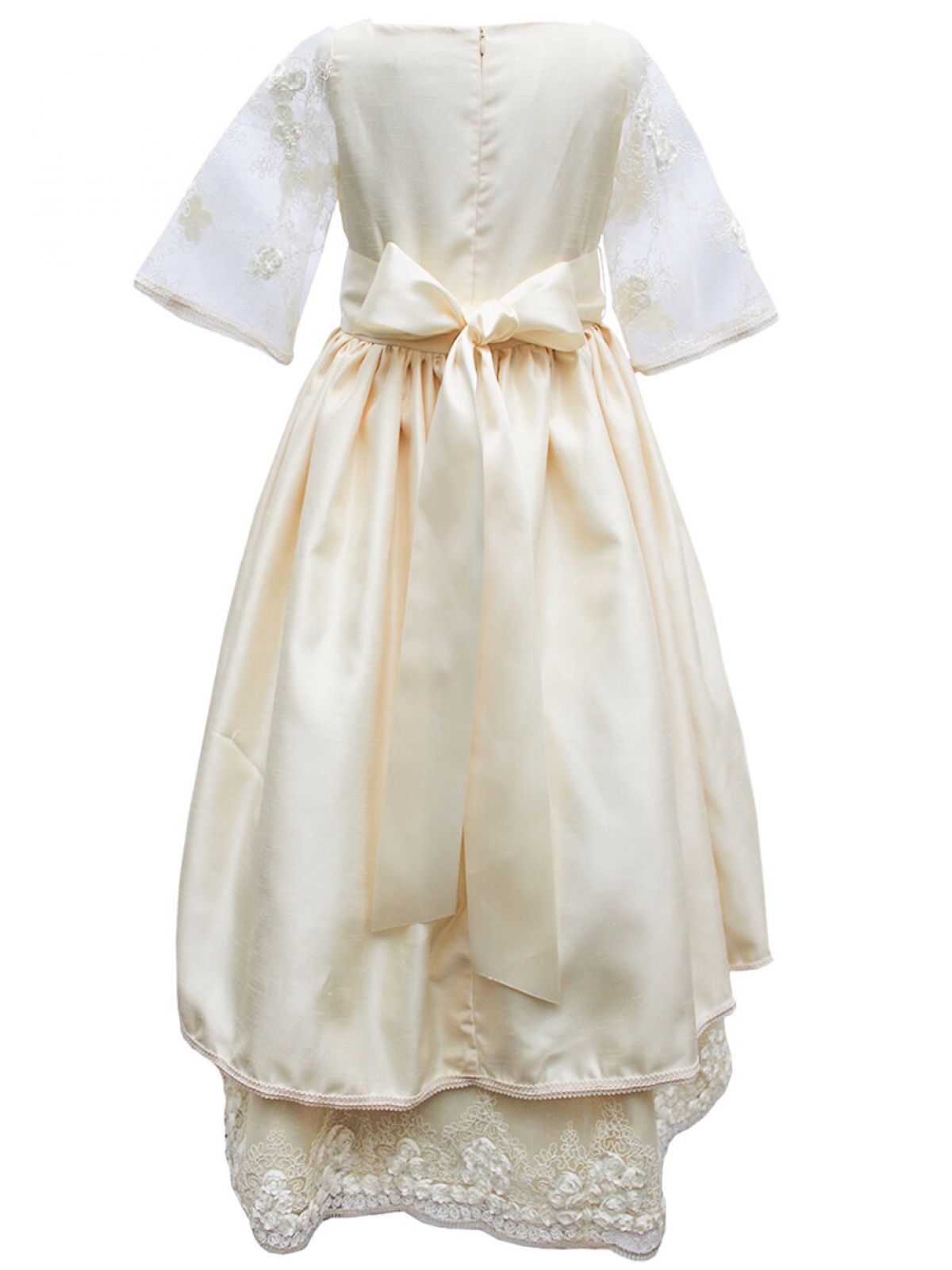 Vestido de primera comunión CARANA, estilo español en tela de shantung de poliéster color vainilla, cuerpo con plisados y cuello redondo, mangas al codo con encaje bordado de flores con relieves, corte en cintura con listón español grueso que rodea toda la cintura hasta la espalda y se sujeta haciendo un moño, falda amplia drapeada larga, espalda con cierre invisible, vestido con forro, tul en faldón interno para dar volumen. Lavado en seco. Medidas talla 10 años: Contorno pecho 76 cm, contorno cintura 71cm, largo de cintura a pies 89cm, con el fajín la cintura se ajusta a la medida deseada. Medidas talla 12 años: Contorno pecho 80 cm, contorno cintura 75cm, largo de cintura a pies 92cm, con el listón la cintura se ajusta a la medida deseada.