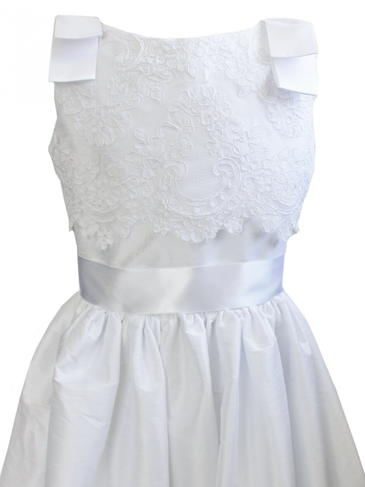 Vestido de primera comunión CARANA, estilo español en tela de shantung de poliéster color blanco, cuerpo con cuello ojal bordado en cuerpo con listón español en hombros formando moños, corte en cintura con falda amplia drapeada larga, espalda con cierre invisible, listón español grueso rodeando la cintura, se sujeta haciendo un moño en la parte trasera, vestido con forro, tul en faldón interno para dar volumen. Lavado en seco. Medidas talla 10 años: Contorno pecho 76 cm, contorno cintura 71cm, largo de cintura a pies 89cm, con el fajín la cintura se ajusta a la medida deseada. Medidas talla 12 años: Contorno pecho 80 cm, contorno cintura 75cm, largo de cintura a pies 92cm, con el listón la cintura se ajusta a la medida deseada.