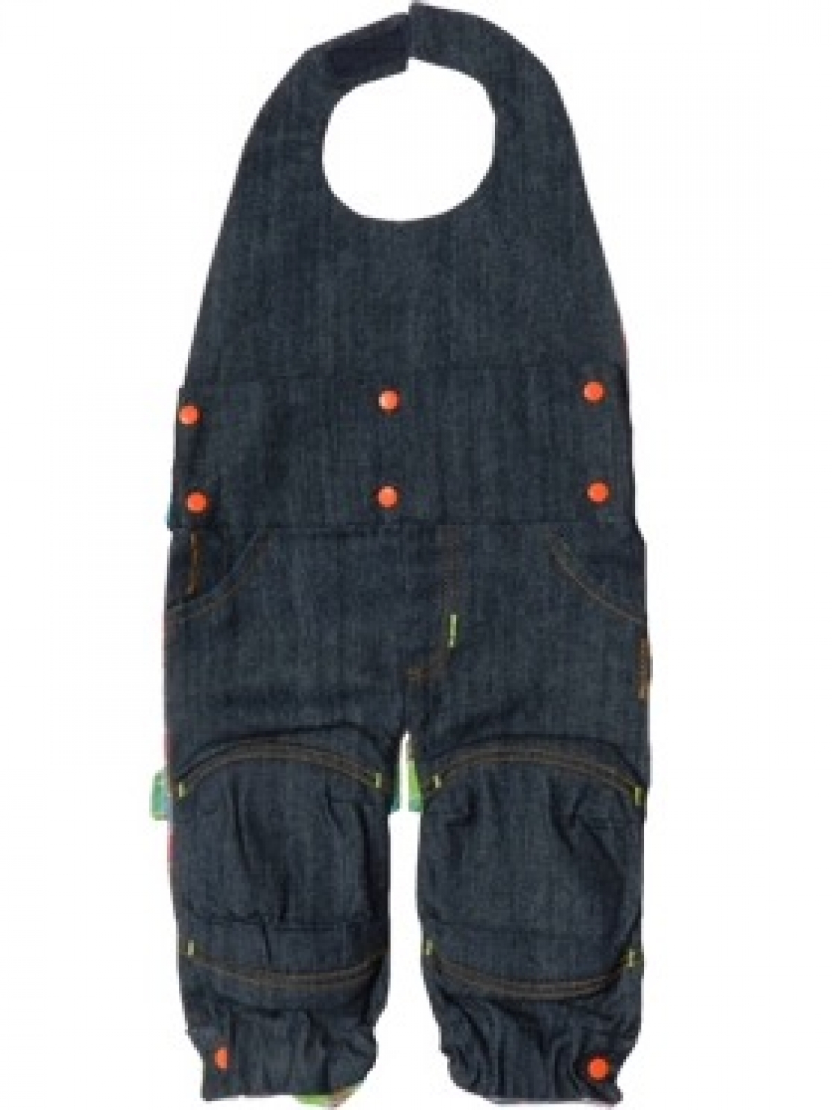 Accesorio para gatear de dos piezas desmontable y expansible, con almohadillas en las rodillas, frente de mezclilla y forro en estampado en cuadros multicolor fondo en verde. Única talla de 6 a 18 meses.