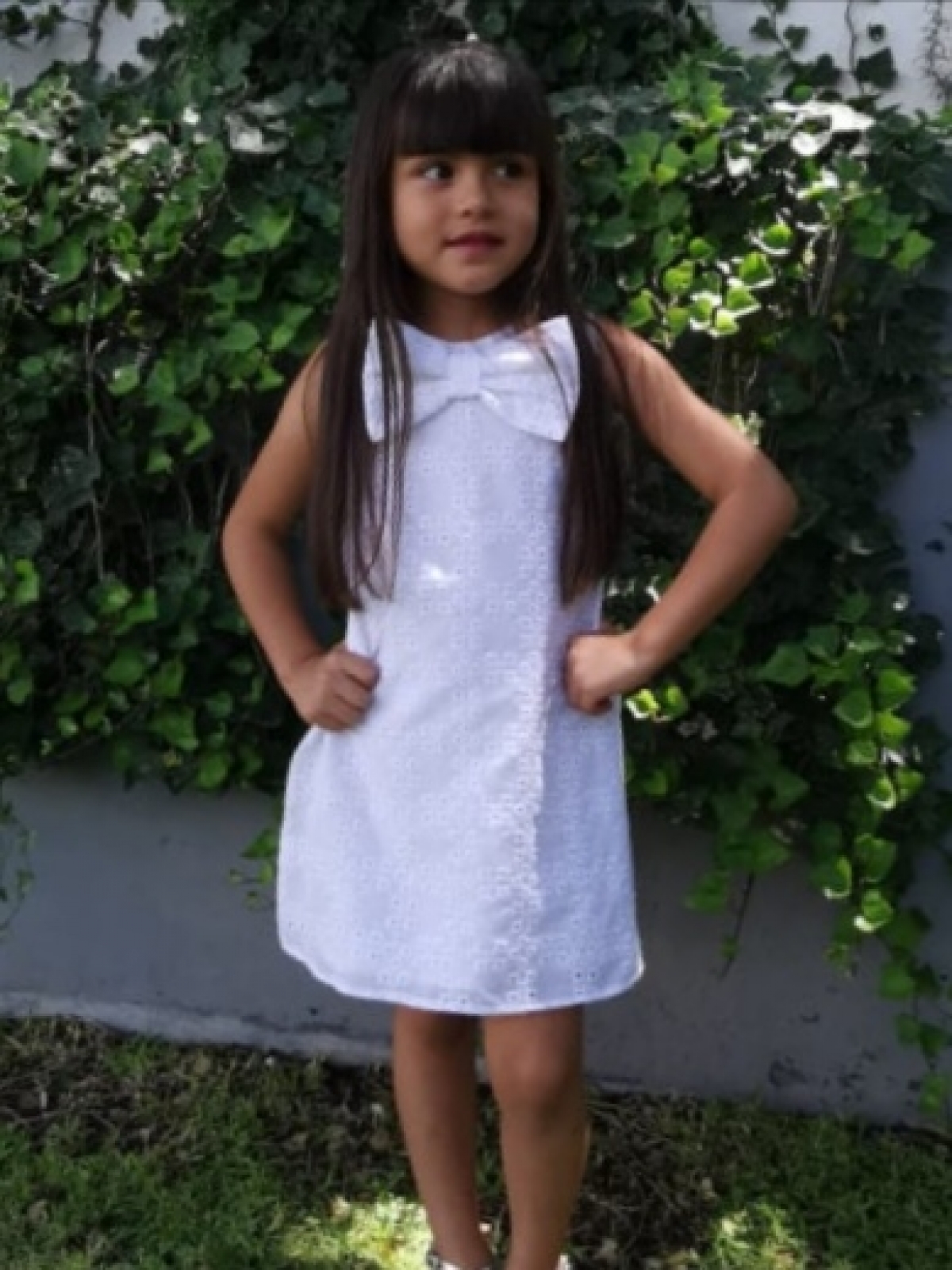 VESTIDO BLANCO LÍNEA A MOÑO PECHO