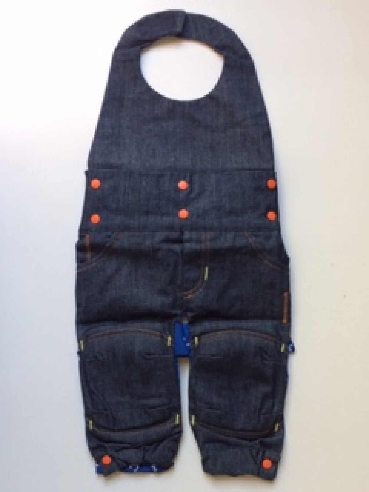Accesorio para gatear de dos piezas desmontable y expansible, con almohadillas en las rodillas, frente de mezclilla y forro en estampado de anclas fondo en azul rey. Única talla de 6 a 18 meses.