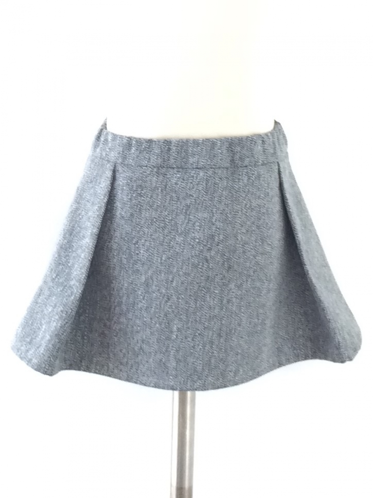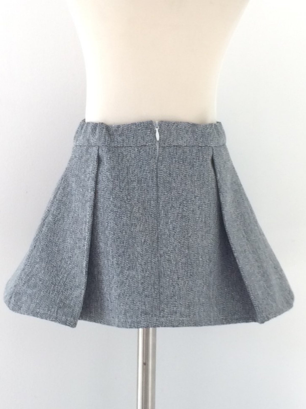 Falda de algodón jaspeada en tonos gris, pretina en cintura con resorte oculto, cierre trasero y piezas encontradas a costados delanteros.