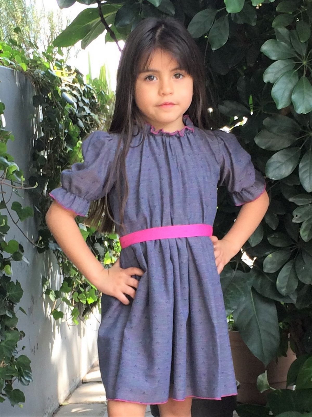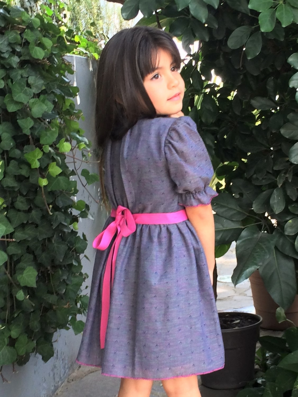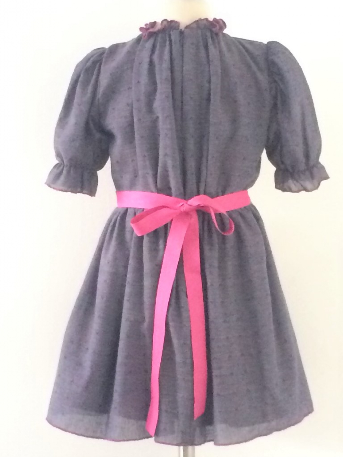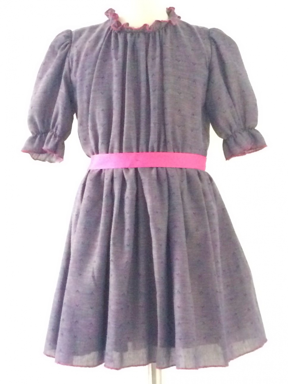 Vestido en algodón ligero en colores tornasol predominando el violeta y estampado en forma de rombos en relieve, cuello alto y drapeado, corte en cintura y falda amplia, con listón en rosa, manga corta amplia.