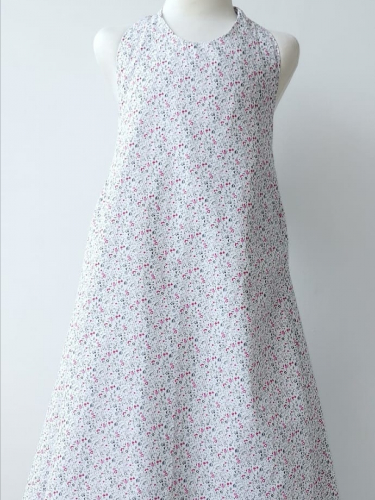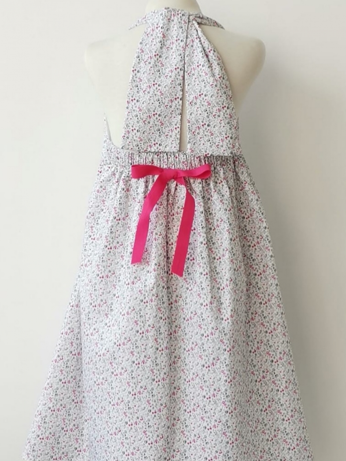 Vestido de algodón estampados con mini flores en fondo blanco, línea A y hombros al descubierto, lazo en cuello para atarse y espalda con resorte y moño.