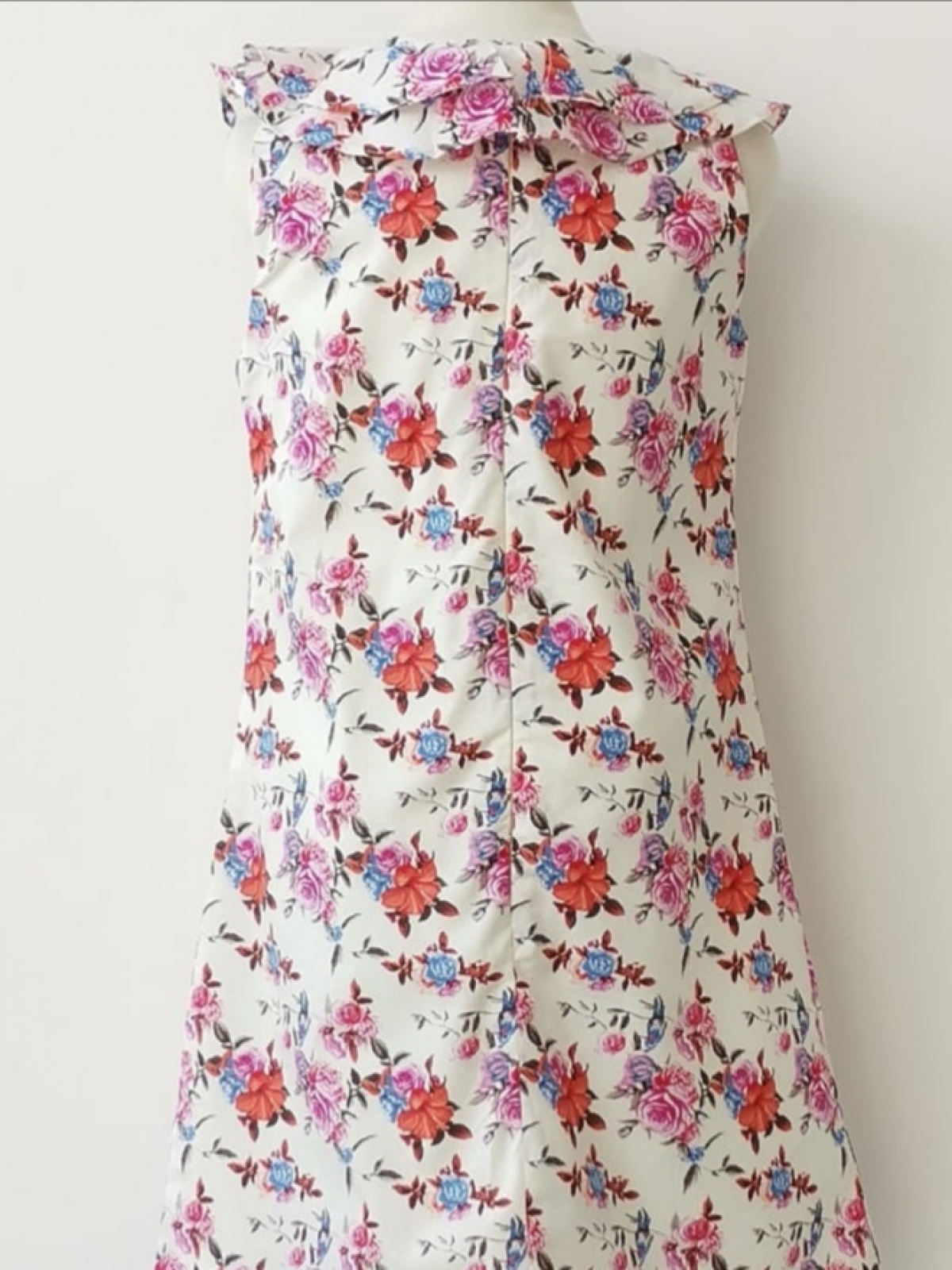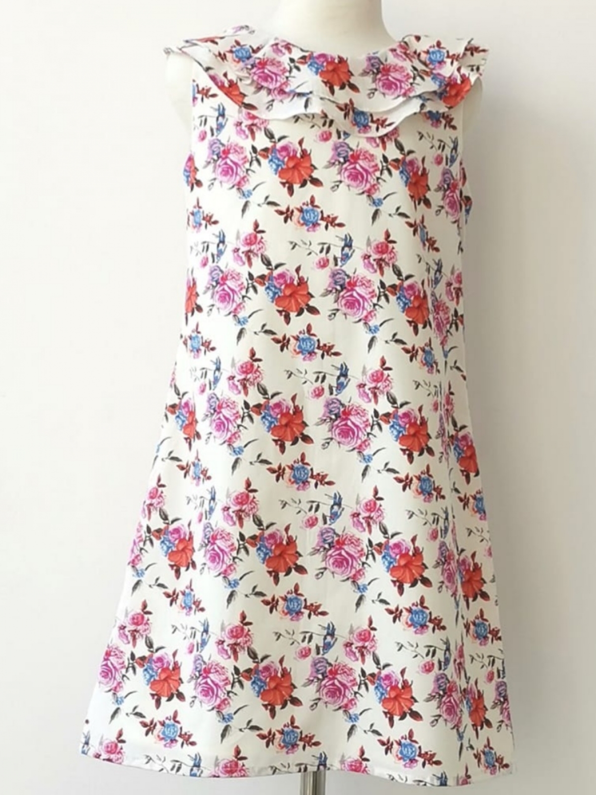 Vestido en algodón estampados en rosas de colores sobre fondo blanco, línea A y dos olanes en cuello.