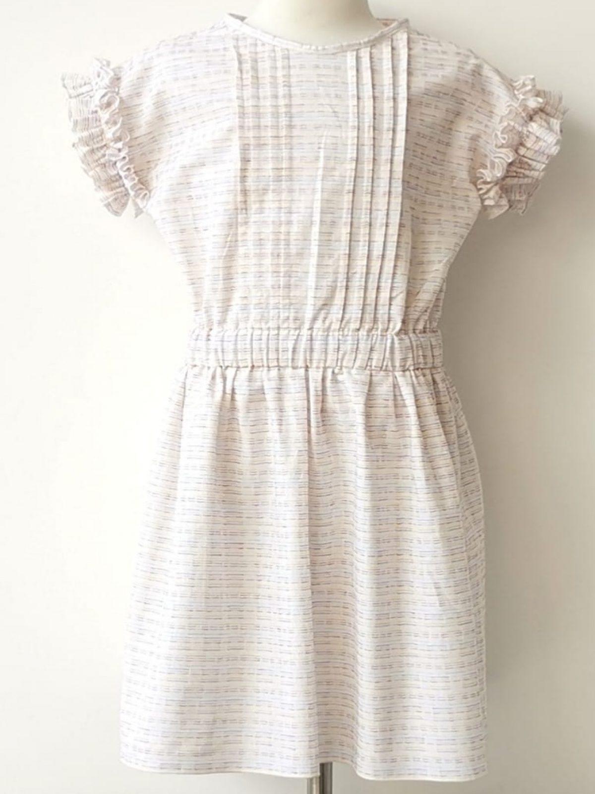 Vestido en algodón fondo blanco y estampado en mini rallas de colores, costuras delanteras en cuerpo, falda amplia con cintura, cuello redondo con doble escatolas en hombros.