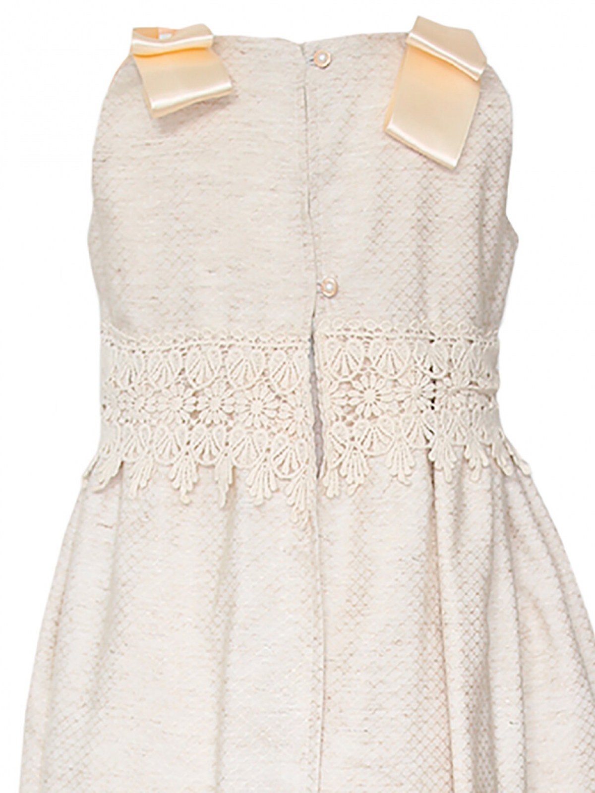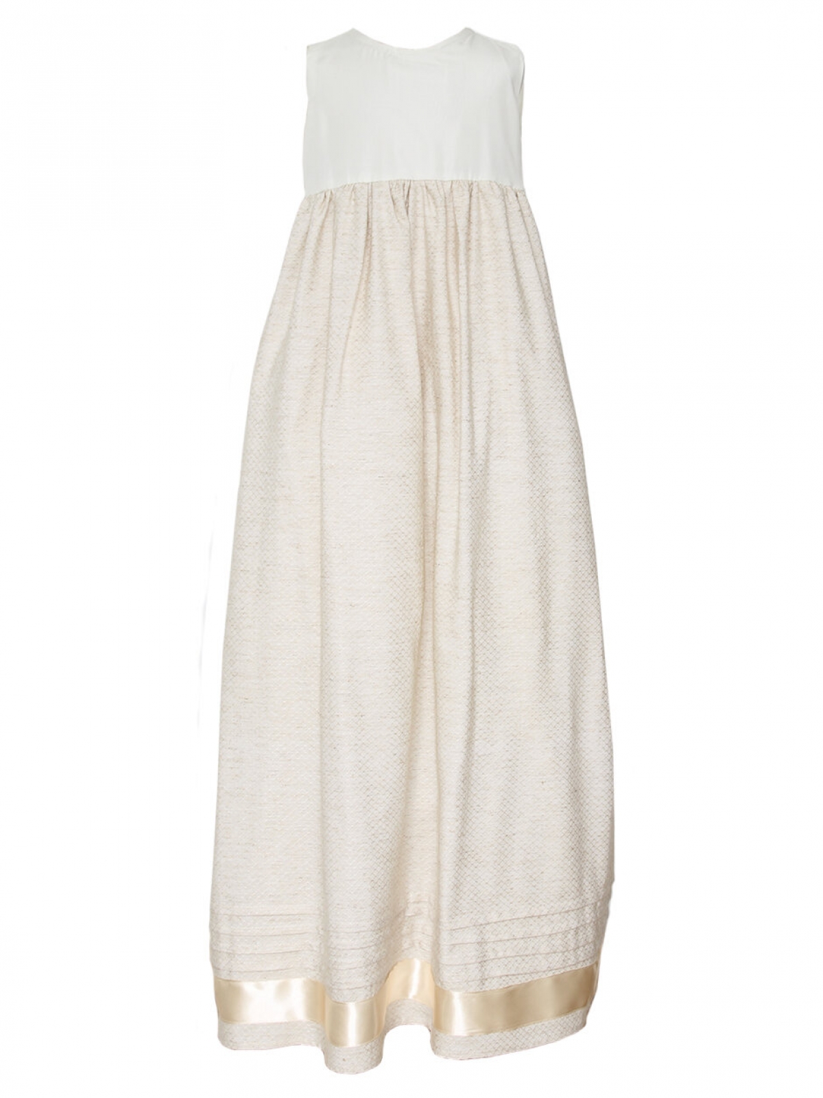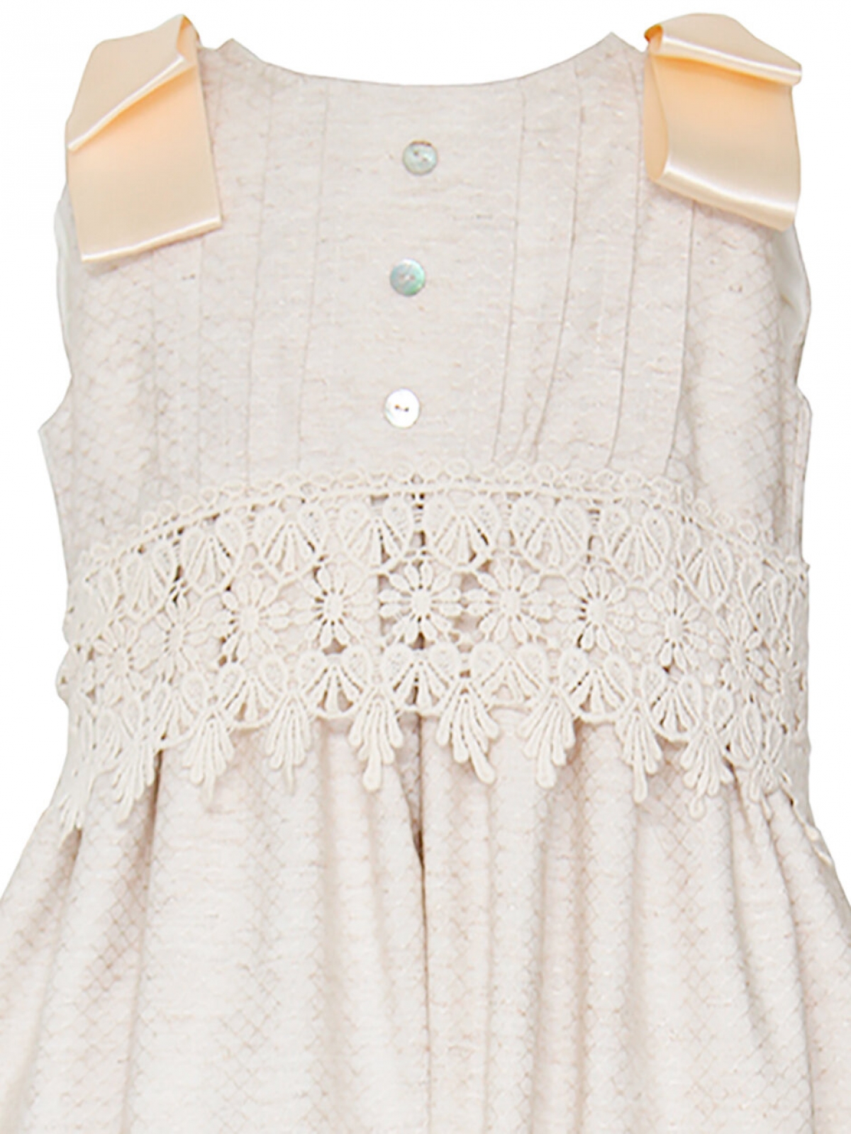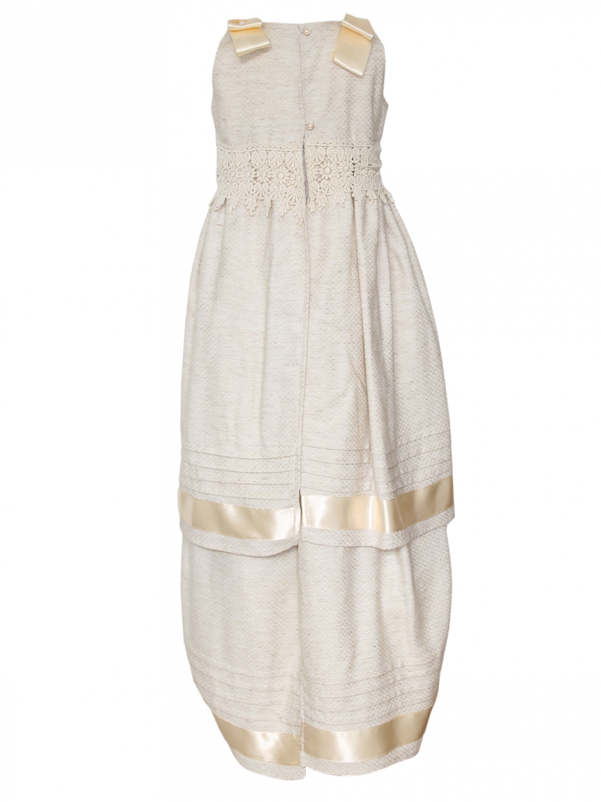 Diseño español, ropón desmontable CARANA estilo español, se compone de dos vestidos, el primero es en algodón, color beige con cuello redondo plisado en pecho con botones de concha, sin mangas y moños de listones en hombros, corte cintura alta con guipur bordado ancho, faldón amplio con detalles y listón en bajo con abertura larga en espalda, el segundo vestido interno es de cuello redondo corte en cintura alta de falda amplia en algodón con un largo de aproximadamente de 70 centímetros forrado, el cual se puede retirar después de la ceremonia. Ambos vestidos se abrochan por la espalda de manera fácil. Lavar en seco.