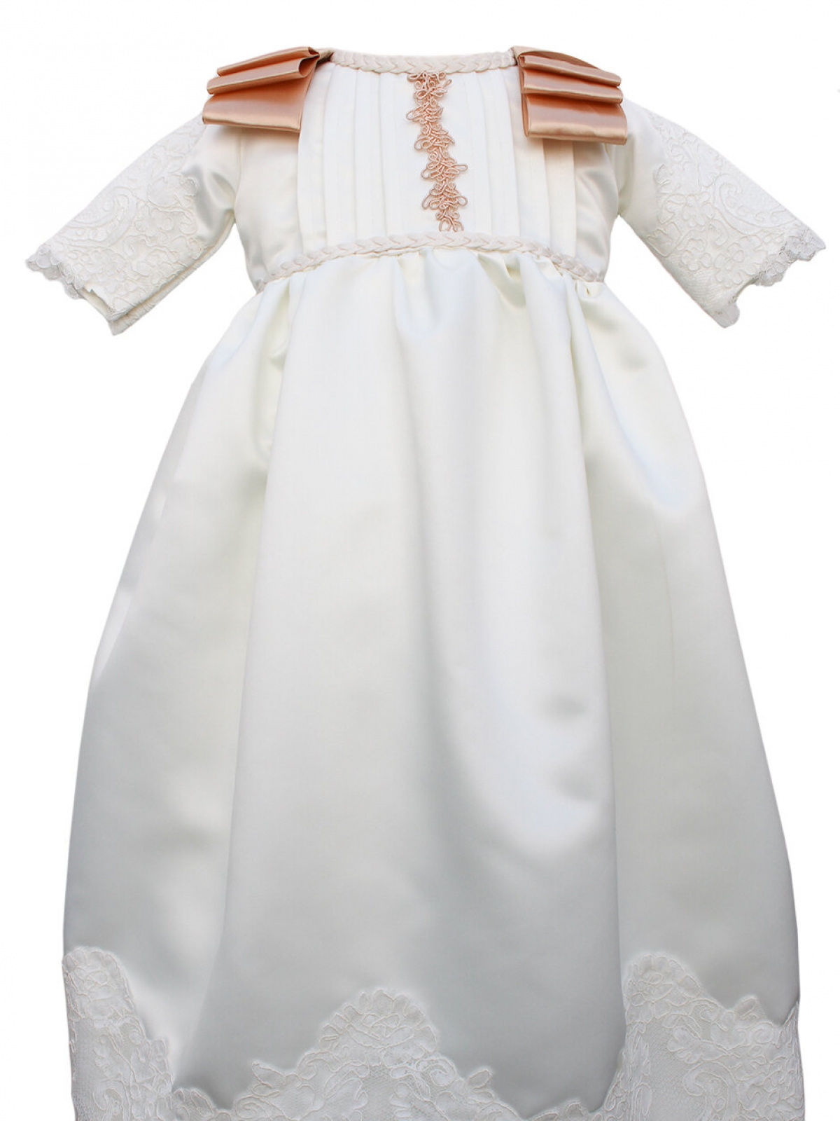 Ropón CARANA con gorro, estilo español, desmontable en color perla, el vestido principal es de cuello redondo con cinta trenzada, plisado en cuerpo, mangas bordadas al codo, corte en pecho con cinta trenzada, falda amplia drapeada en tela satinada con bordados en bajos, espalda abierta completa sujeta con tres botones de perlas en cuerpo, el vestido bajo es de cuello redondo sin mangas con corte en pecho, falda amplia larga drapeada con tela satinada, bordados en bajos de faldón, espalda abierta la cual se sujeta en el cuerpo con tres botones de perlas. Tela de poli satín, encaje, forro de poliéster, única talla. Lavar en seco.