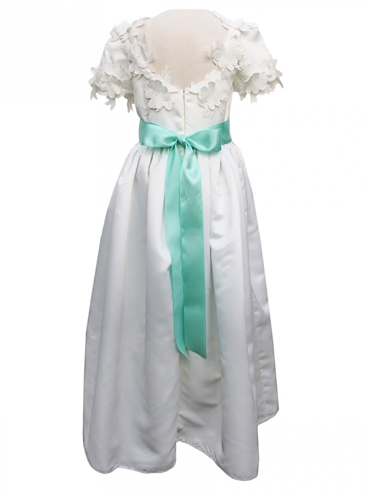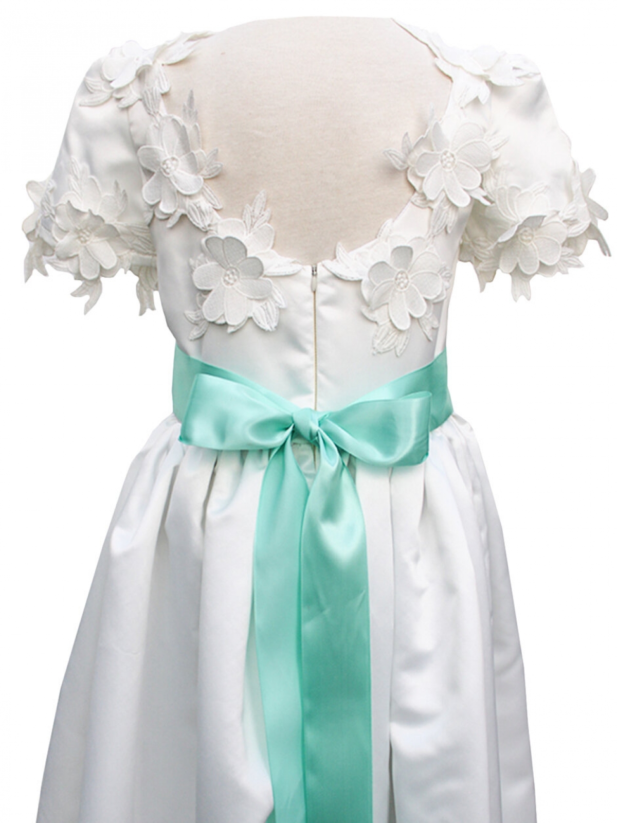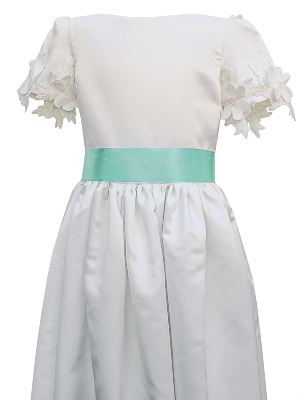Vestido de primera comunión CARANA, estilo español en tela satinada de poliéster color off white, cuello ojal, cintura con listón ancho español en diferentes colores a elegir, manga corta con guipur ancho con flores de tercera dimensión al tono, espalda escotada redonda con guipur de flores de tercera dimensión y cierre invisible, el listón español largo se ata en la parte de la espalda ajustándolo al tamaño de cintura, vestido forrado de poliéster, tul en faldón interno para dar volumen. Lavado en seco. Medidas talla 10 años: Contorno pecho 76 cm, contorno cintura 71cm, largo de cintura a pies 89cm, con el fajín la cintura se ajusta a la medida deseada. Medidas talla 12 años: Contorno pecho 80 cm, contorno cintura 75cm, largo de cintura a pies 92cm, con el fajín la cintura se ajusta a la medida deseada.