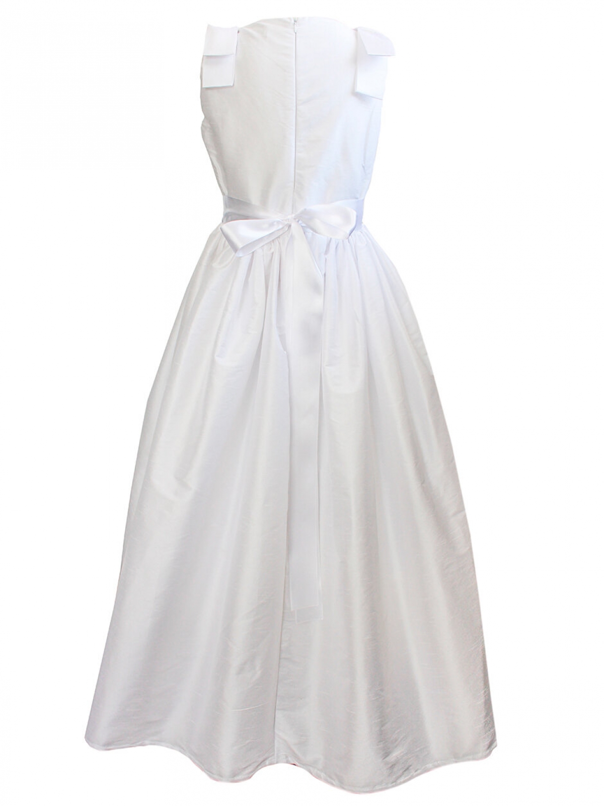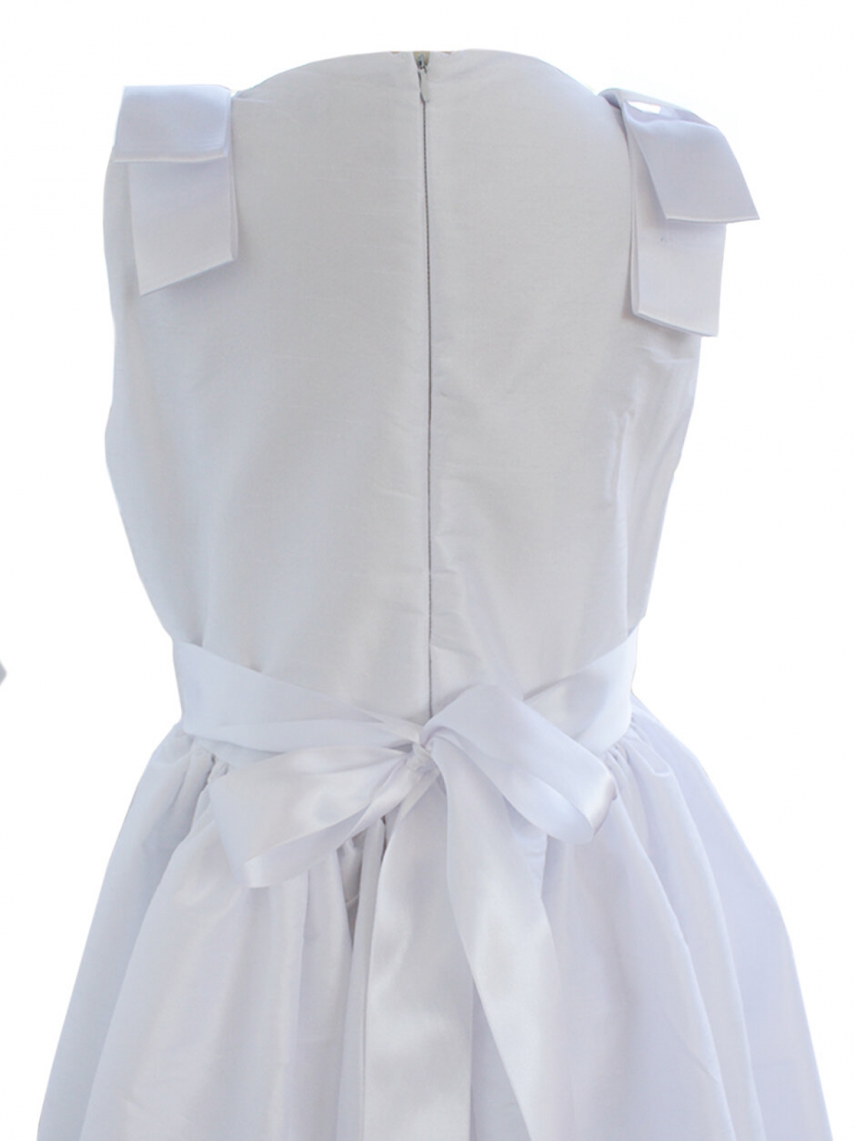 Vestido de primera comunión CARANA, estilo español en tela de shantung de poliéster color blanco, cuerpo con cuello ojal bordado en cuerpo con listón español en hombros formando moños, corte en cintura con falda amplia drapeada larga, espalda con cierre invisible, listón español grueso rodeando la cintura, se sujeta haciendo un moño en la parte trasera, vestido con forro, tul en faldón interno para dar volumen. Lavado en seco. Medidas talla 10 años: Contorno pecho 76 cm, contorno cintura 71cm, largo de cintura a pies 89cm, con el fajín la cintura se ajusta a la medida deseada. Medidas talla 12 años: Contorno pecho 80 cm, contorno cintura 75cm, largo de cintura a pies 92cm, con el listón la cintura se ajusta a la medida deseada.
