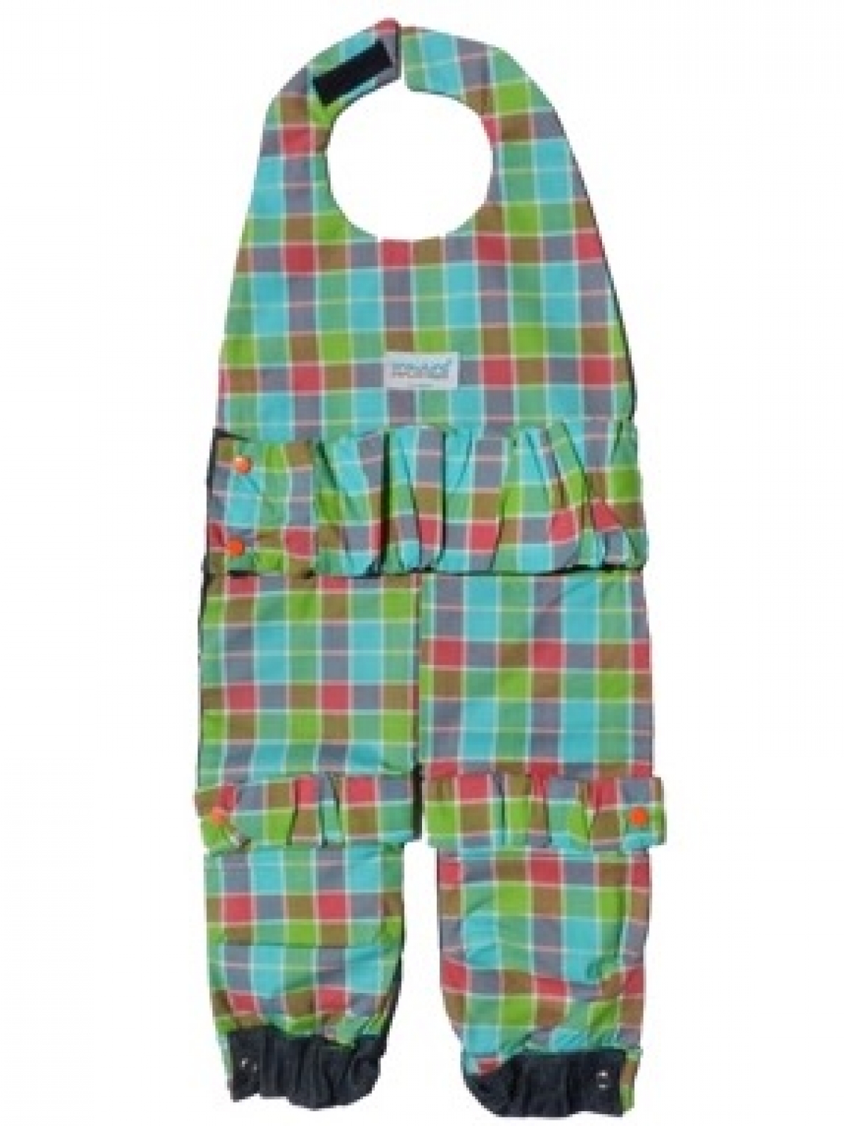 Accesorio para gatear de dos piezas desmontable y expansible, con almohadillas en las rodillas, frente de mezclilla y forro en estampado en cuadros multicolor fondo en verde. Única talla de 6 a 18 meses.